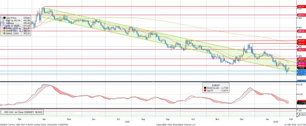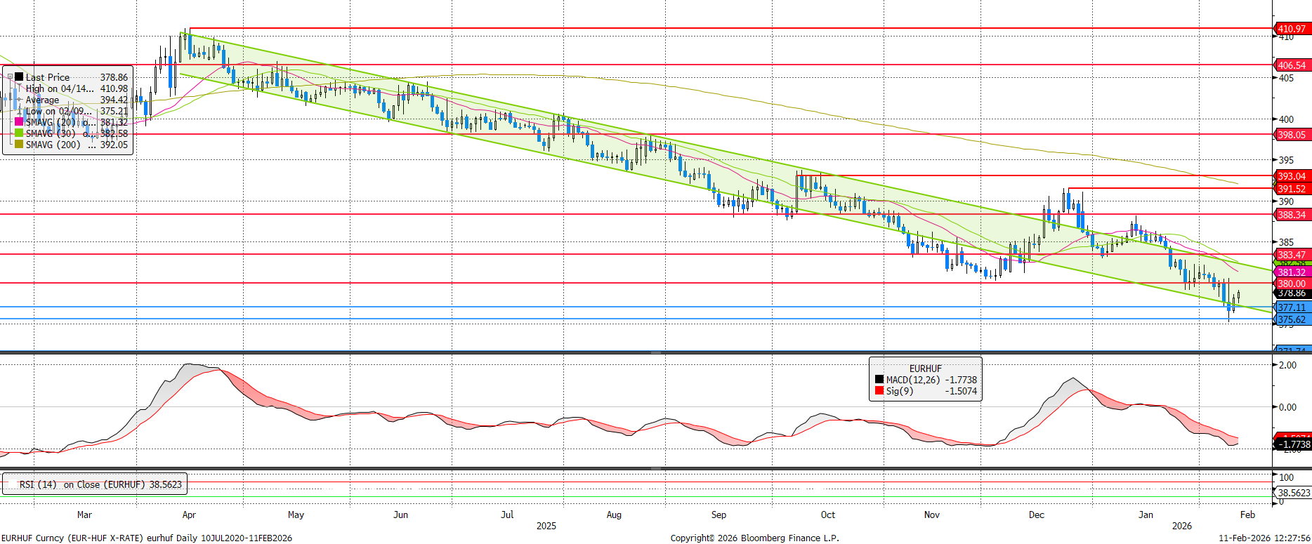 Újabb lokális mélypontot sikerült beállítani az EURHUF jegyzésének, bőven a csökkenő trendcsatorna és a 375,6-os támasz alá szúrva. Innen visszapattant, viszont a 380-as ellenállást még mindig nem érte el. Továbbra is a 377,1 és 380 közötti sávon belüli bolyongás a legvalószínűbb forgatókönyv.