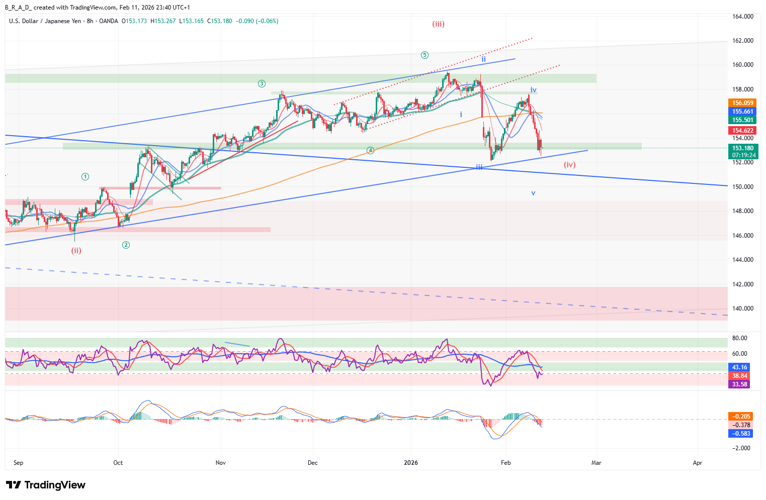 A következő időszakban további esésre számítunk nagyobb eséllyel az elsődleges célár 152,100, a másodlagos 151,200.