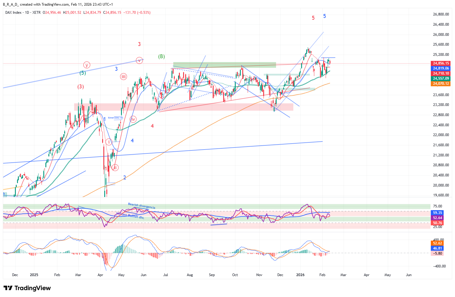 Technikai értelemben egy dupla aljat láthatunk. 25.100 átlépésével (nyakvonal) megkaphatja a megerősítést, a formáció célára 26.000 alá mutat. A formáció megerősítését jelenheti az MACD-n látható ZLR (Zero Line Reversal).