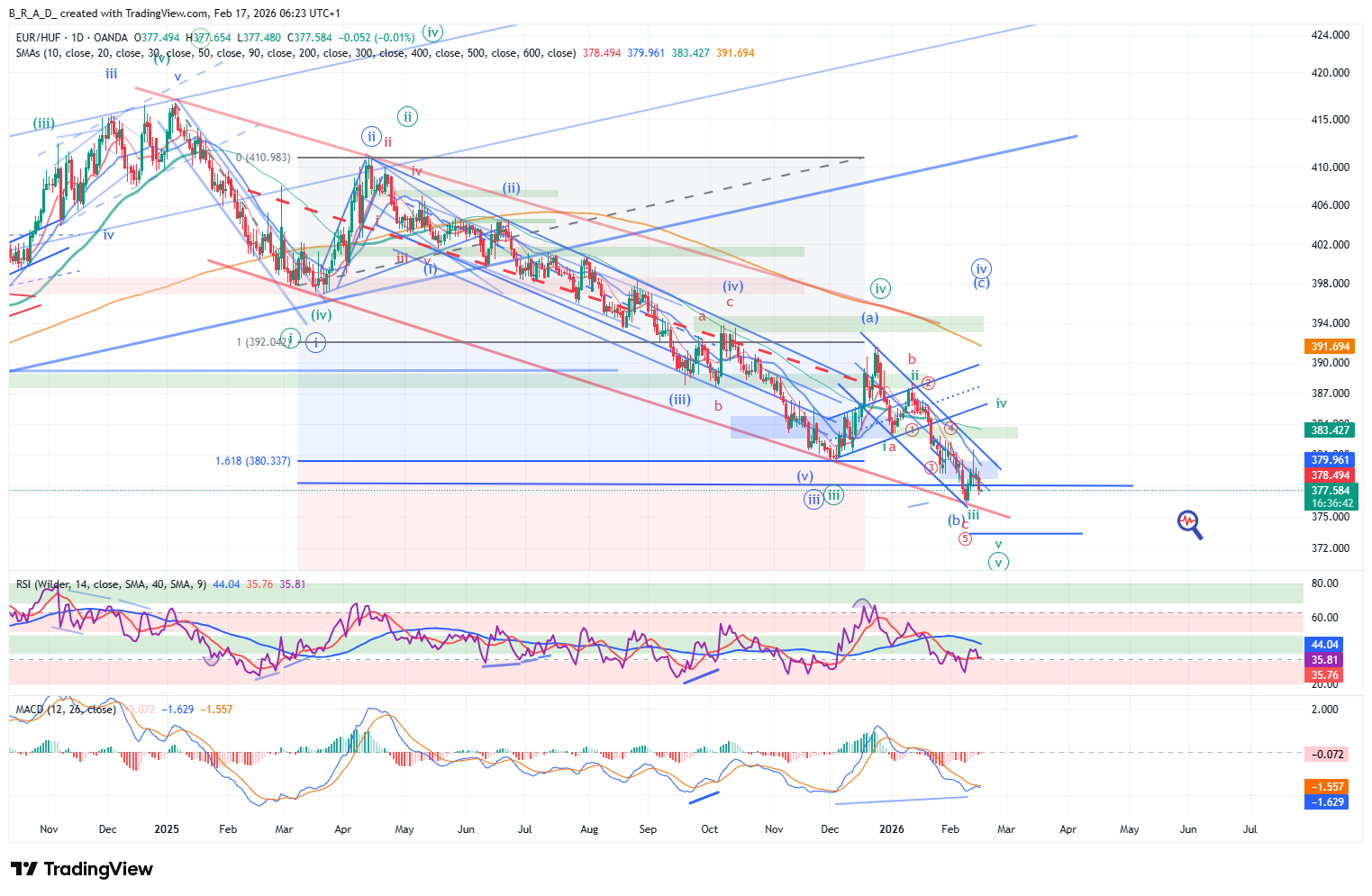 Kialakult és megerősítést kapott a legutóbbi elemzésben említett short indikátor-konfiguráció. A formáció célára 375,50 környékére mutat, 58%-os megbízhatósági szint mellett. A célár elérésére csak abban az esetben van lehetősége az árfolyamnak, ha az elsődleges számozásunkkal ellentétben a déli irányú mozgás nem a korrekció második alhulláma (zöld számozás szerinti verzió), hanem a déli irányba tartó szekvencia utolsó, azaz 5. hulláma. Az alakzat besülési szintje 381,60, a zölddel jelölt számozás kritikus szintje 382,50 felett található, ennek elérésével a formáció működésének valószínűsége minimálisra csökken, 383,50 feletti zárással pedig végleg megszűnik.