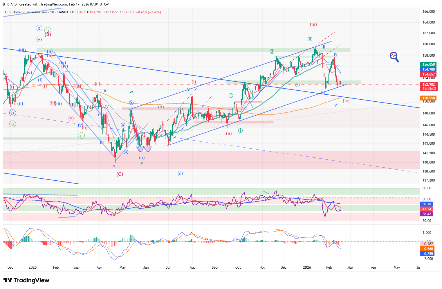 A következő időszakban alacsony megbízhatósági szint mellett további esésre számítunk nagyobb eséllyel az elsődleges célára ismét 152,100, a másodlagos 151,200.