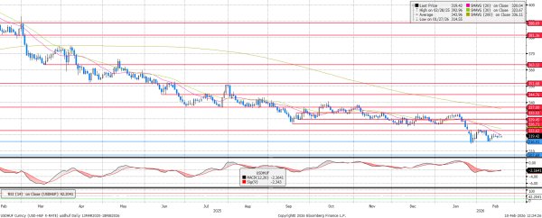 A 316-os támaszról való felpattanást követően csak a 320 körüli árfolyamig volt ereje a dollárnak erősödni a forinttal szemben, végül az ide leereszkedő 20 napos mozgóátlaggal ütközött. Az MACD vételi jelzést adott, ami segíthet a 322,6-os ellenállást tesztelnie, bár az áttöréshez kevésnek bizonyulhat.
