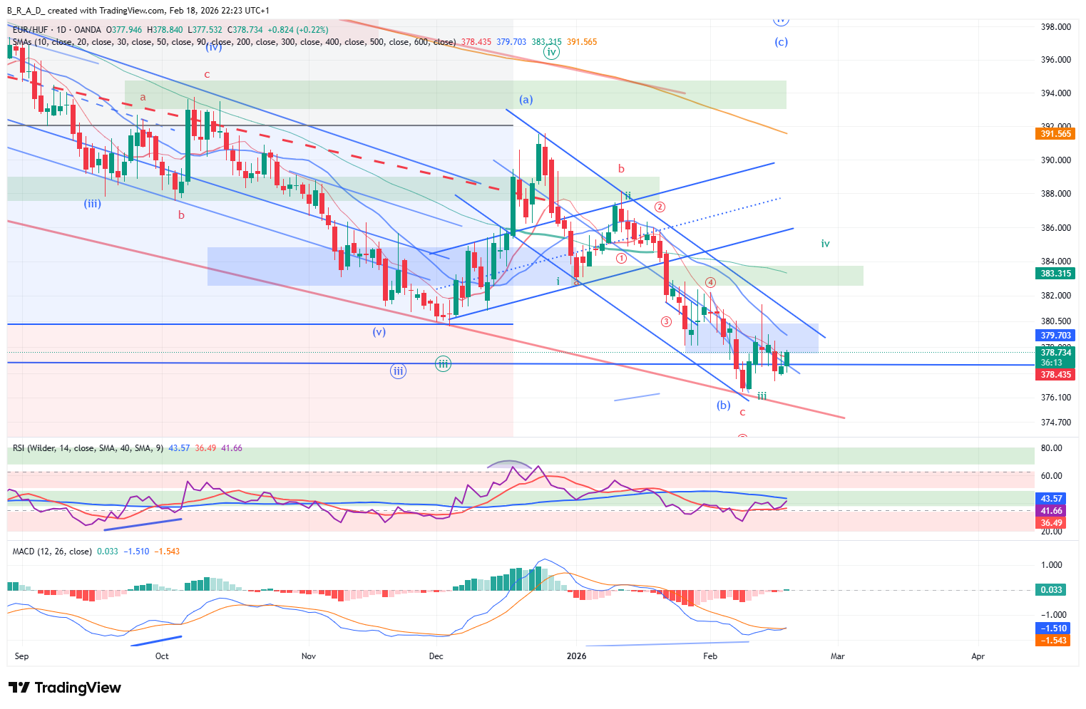 Kialakult és megerősítést kapott a legutóbbi elemzésben említett short indikátor-konfiguráció. A formáció célára 375,50 környékére mutat, 58%-os megbízhatósági szint mellett. A célár elérésére csak abban az esetben van lehetősége az árfolyamnak, ha az elsődleges számozásunkkal ellentétben a déli irányú mozgás nem a korrekció második alhulláma (zöld számozás szerinti verzió), hanem a déli irányba tartó szekvencia utolsó, azaz 5. hulláma. Az alakzat besülési szintje 381,60, a zölddel jelölt számozás kritikus szintje 382,50 felett található, ennek elérésével a formáció működésének valószínűsége minimálisra csökken, 383,50 feletti zárással pedig végleg megszűnik.