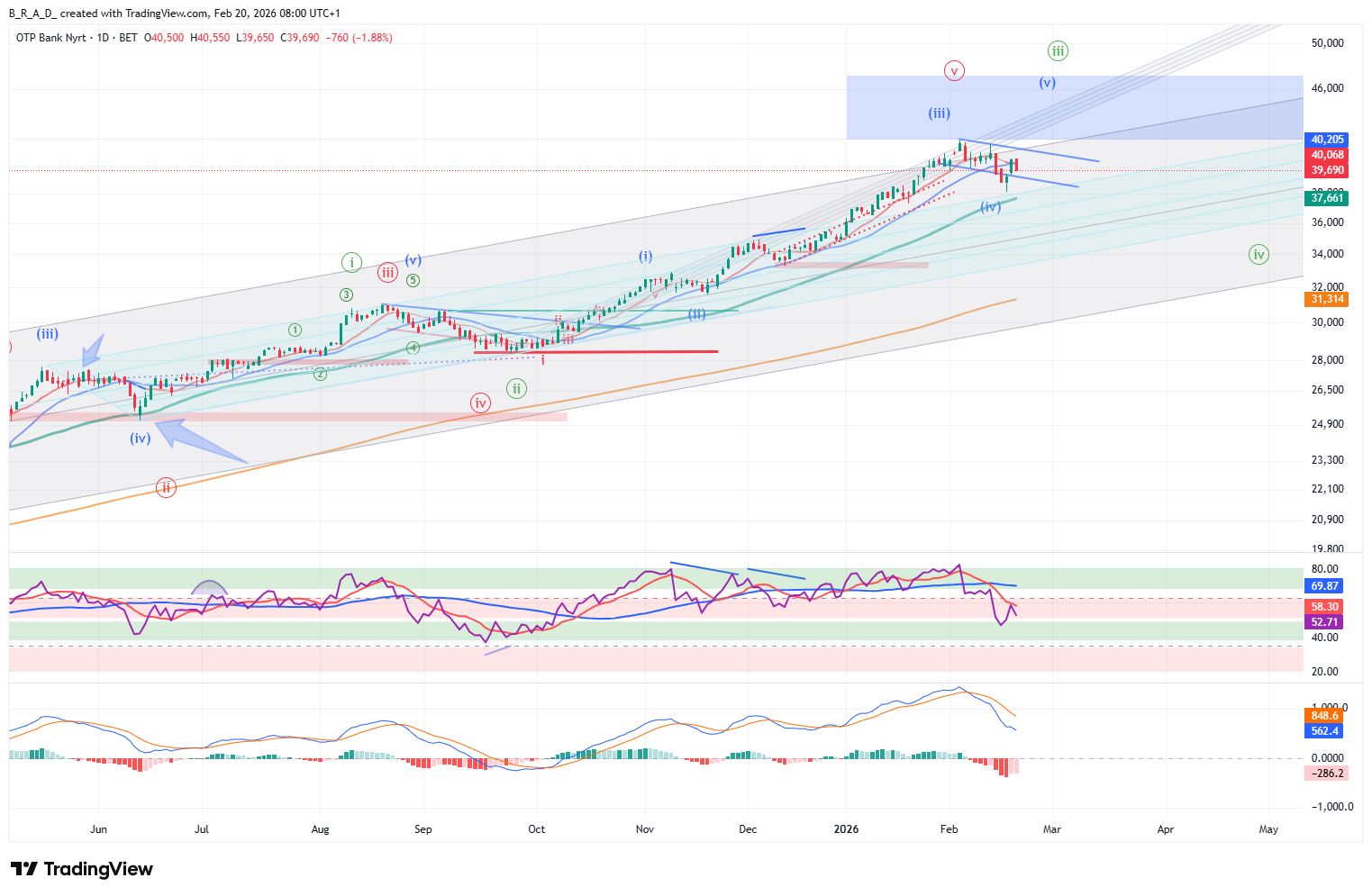 A következő időszakban a legnagyobb esélyt annak adjuk, hogy 39.100 alá beesik az árfolyam, mely egy 400 pontos sáv teteje, ha a sáv megfogja az esést, akkor emelkedés indulhat, amely 41.000 fölé viheti a részvény árfolyamát. A korábbi alj 38.130-nál bull szempontból kritikus szint, letörése egy időre elveti az új csúcs kialakulásának lehetőségét.