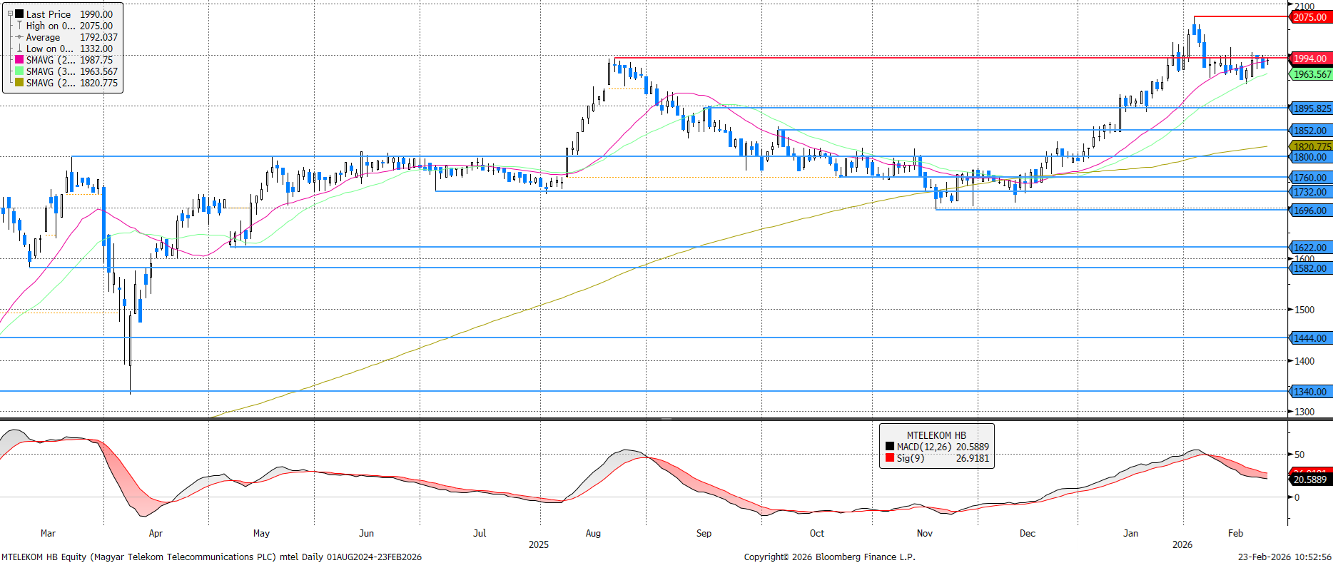Szerda délután, piaczárást követően érkezik majd a Magyar Telekom gyorsjelentése, addig jelentős elmozdulás már nem várható a részvénytől, főleg, hogy technikai szintekkel sűrűn átszőtt területen van az árfolyam. Támaszt a 20 és a 30 napos mozgóátlag jelent 1.988 és 1.964 forintnál, míg ellenállások 1.994 és 2.000 forintnál láthatóak, így minden irányba rendkívül szűk a mozgástér.