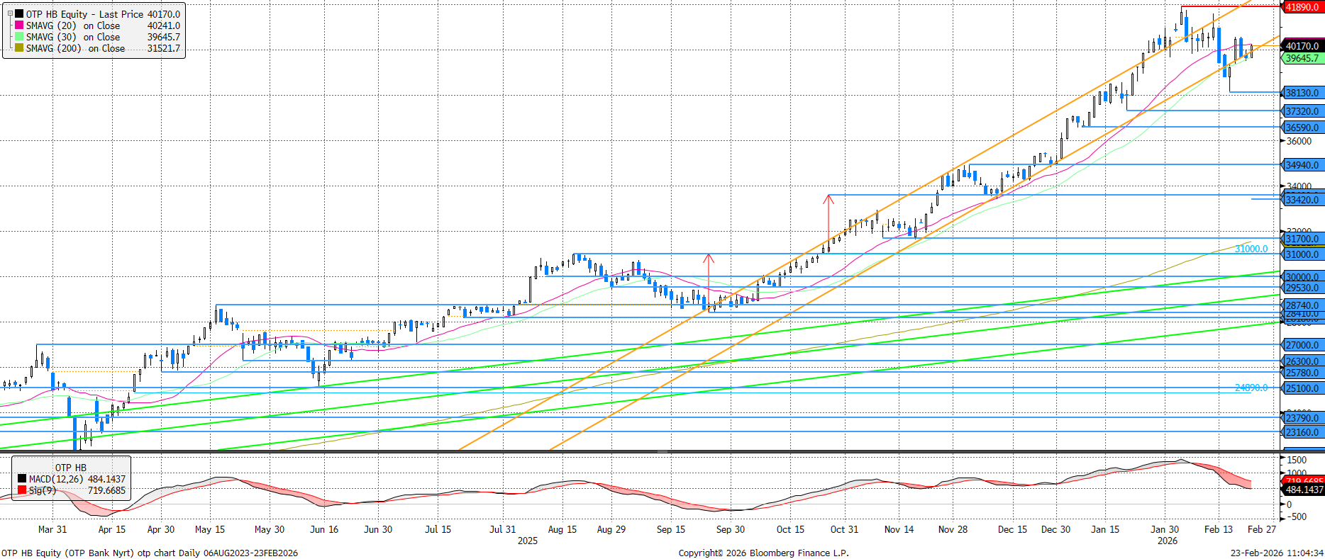 Egy leszúrástól eltekintve az emelkedő trendcsatorna alsó élére, egyben a 30 napos mozgóátlagra esett az OTP árfolyama. A történelmi csúcsról indult korrekció ezzel véget érhetett, a korábbi túlvettség már a múlté, így az emelkedő trenddel együtt emelkedhet az árfolyam a következő napokban. Kisebb ellenállást a 20 napos mozgóátlag jelenthet.