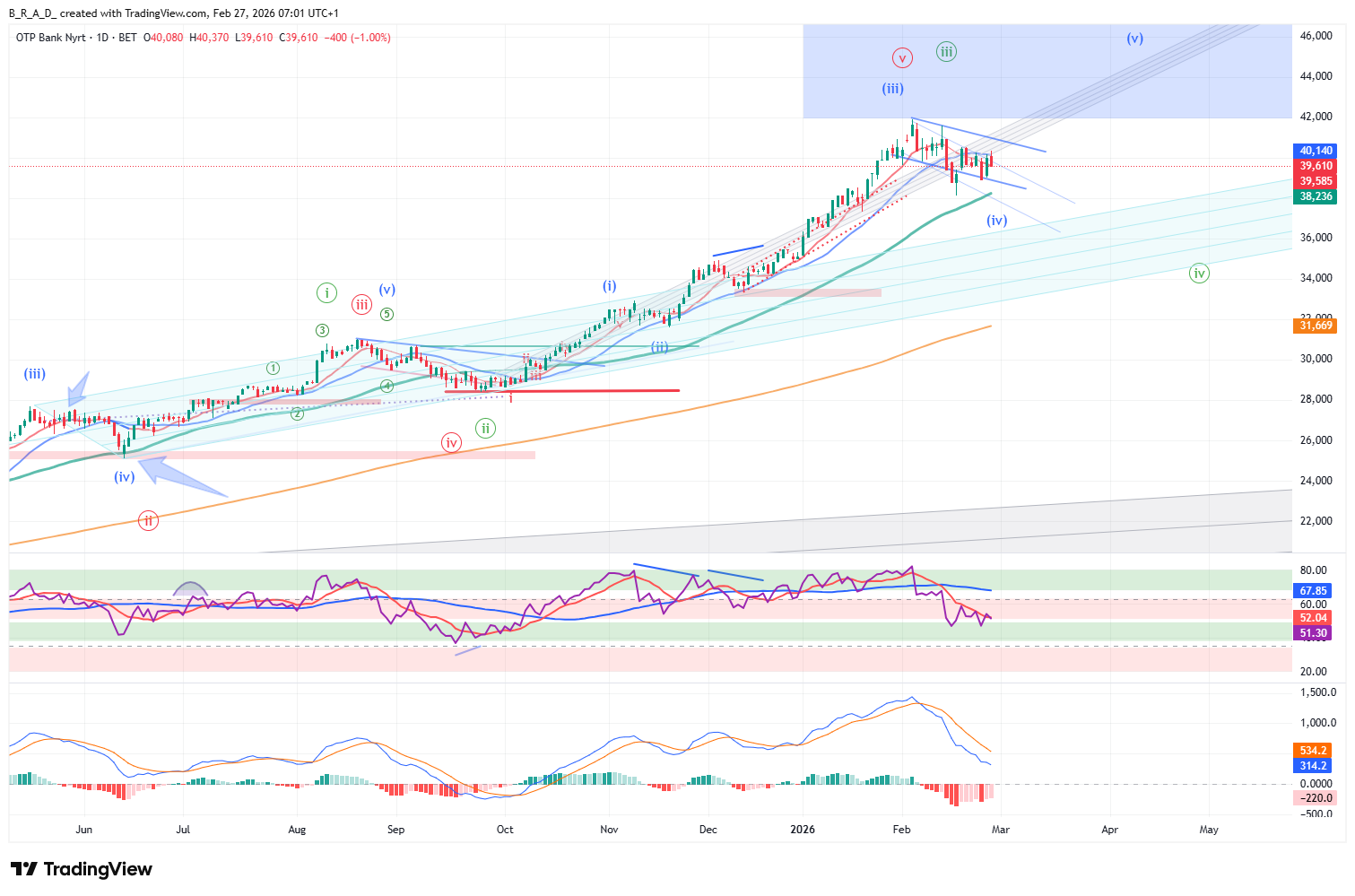 A következő időszakban további emelkedésre számítunk, az elsődleges célár 40.100, a másodlagos 40.920.