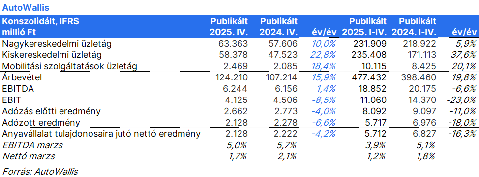A negyedik negyedévben is tovább folytatódott az AutoWallis bevételeinek növekedése. Mindhárom szegmens kétszámjegyű árbevétel növekedést tudott felmutatni, így a csoportszintű árbevétel 15,9%-kal bővült. A bevételek dinamikus bővülése ellenére a...