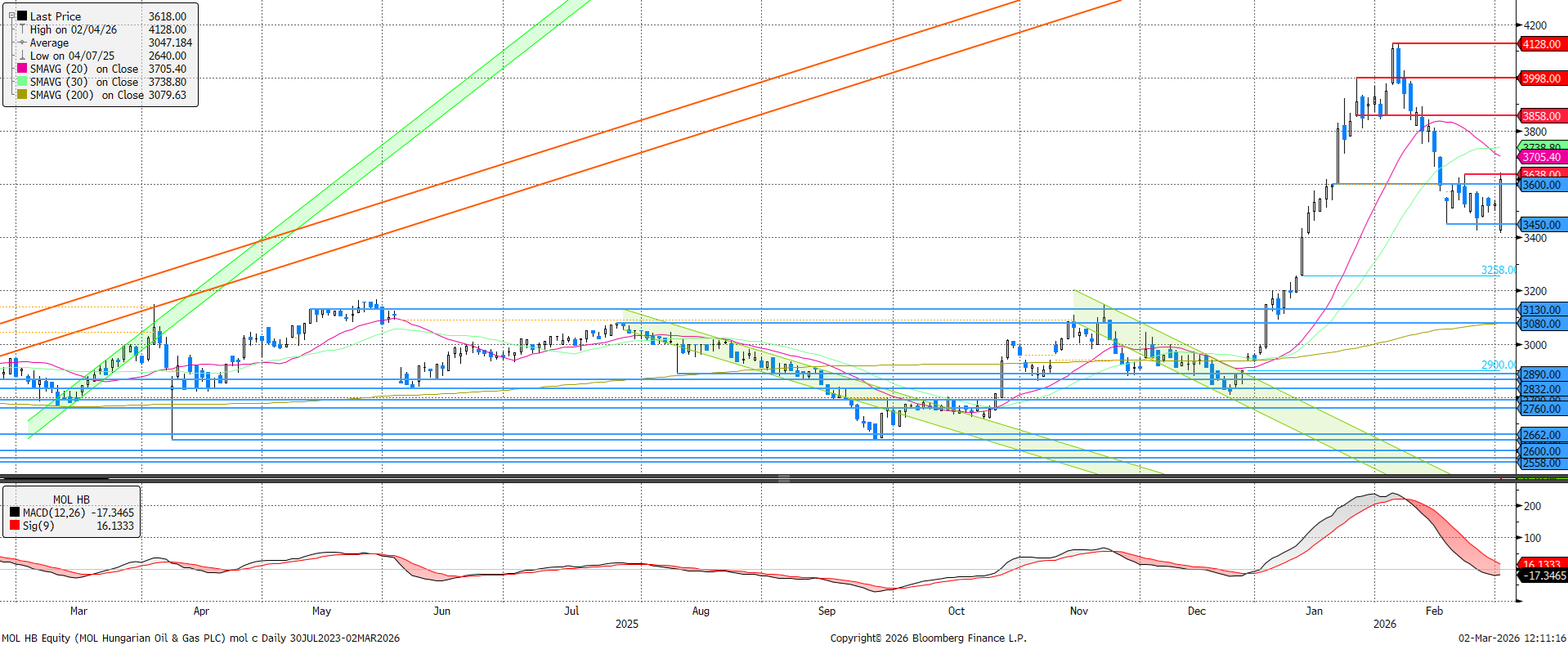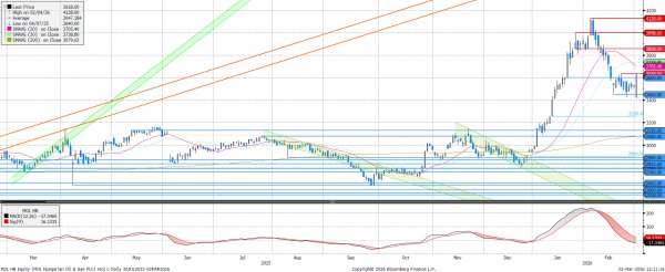 Az emelkedő olajár hatására megugrottak az olajcégek, köztük a MOL is, mely már amúgy is a korrekciós periódus vége felé járt, így további emelkedés várható tőle. Ellenállás 3.638 és 3.705 forintnál látható. A barátság kőolajvezeték újra indulásának időpontja továbbra is bizonytalan, bár Ukrajna már több ígéretet is tett az újraindítás időpontjára vonatkozóan.