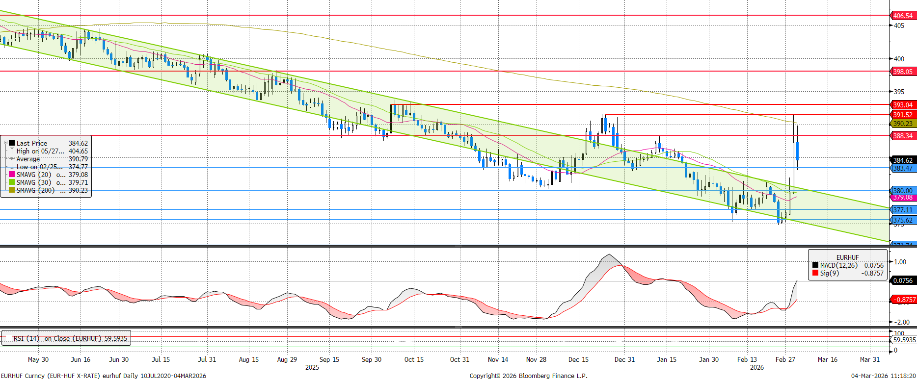 A hétvégén kirobbant közel-keleti történések miatt könnyes búcsút intettünk a 380 alatti jegyzésnek az EURHUF esetében. A trendcsatornából kiugrott az árfolyam, sőt, a 200 napos mozgóátlag 390-es szintje is játékba jött átmenetileg. Az MACD vételi jelzése inkább csak technikai adalék volt mindehhez. Jelentős napon belüli mozgások jöhetnek még a következő napokban, de talán a nehezén túl van a forint rövidtávon.