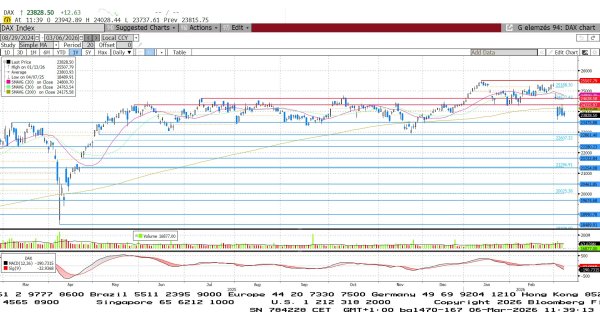 Az iráni háború az EU-t különösen érzékenyen érinti, mivel ki van szolgáltatva a Közel-Keletről származó energiahordozóknak. A német tőzsde nagyot esett a fegyveres konfliktus kirobbanása után. Hétfőn még támaszt nyújtott a 24.639 pontos szint, de kedden már a 200 napos mozgóátlag alatt nyitott az index, és jelenleg is ott tartózkodik. AZ MACD indikátor eladási jelzést adott, az RSI már közel áll a túladottsághoz, de nyomás alatt maradhat a DAX, amíg nem enyhül a háború.