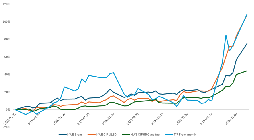 Az alábbi ábra azt mutatja, hogy miként alakult a Hormuzi-szoros lezárása miatt érintett, Európában kereskedett energiahordozók ára az év eleje óta. A következő érdekes megállapításokat lehet tenni: