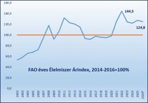 A történelmi szintekhez képest az FFPI 1,3 ponttal (1,0%) volt az előző évi értéke alatt, és 34,9 ponttal (21,8%) alacsonyabb volt a 2022 márciusi csúcshoz képest.
