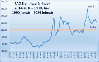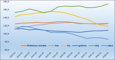 A tavalyi éves növekedést idén eddig mérséklődés követte, de ha havi bontást veszünk, még érdekesebb a kép. A FAO élelmiszerár-index (FFPI) ugyanis februárban öt hónap után először emelkedett. Ezt leginkább a gabonafélék, a hús- és növényi olaj árak okozták. Ami különösen látványos ártrend, az a tejtermékárak és a cukor tartós mérséklődése, valamint a növényi olajok drágulása. Ezek eredőjeként az index 2026 februárjában átlagosan 125,3 pontot mutatott, ami 1,1 pontos (0,9%) emelkedés a januári szinthez képest.