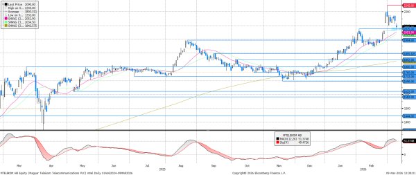 Támaszhoz ért ma reggel az MTel, miközben az MACD hamarosan eladási jelzést adhat. A 2.075 forintos támaszszint és a 2.065 forintnál hagyott rés együttese megküzdhet a lefelé irányuló nyomással, így összességében oldalazásra számítunk.