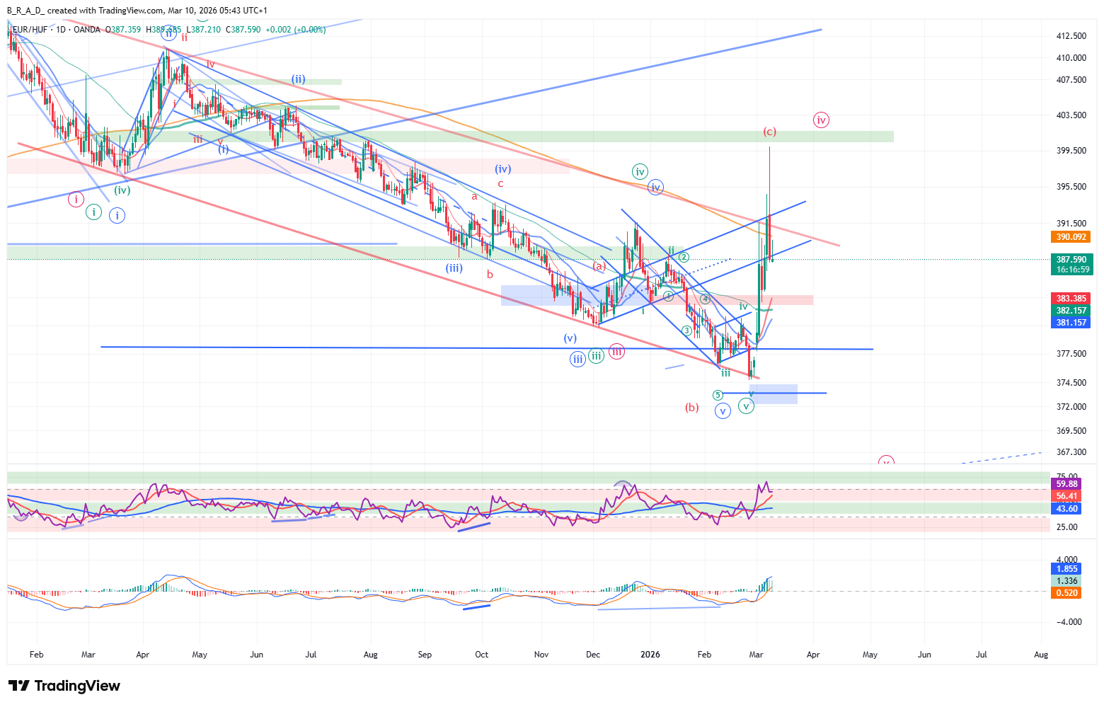 Az erős emelkedés átvitte az elliotti szempontból kritikus szintet, de még nem zárt felette (397,95). Ha ez hetes idősíkon megtörténik, akkor a pirossal jelölt, forinterősödést mutató szcenáriót el kell vetni, addig azonban evidenciában kell tartani, még akkor is, ha jelenleg alacsony a valószínűsége. Azonban a 382-nél lévő támasz áttörésekor az említett forinterőre mutatott szcenáriót újra a figyelem központjába kell helyezni.