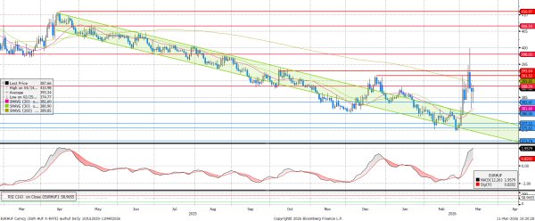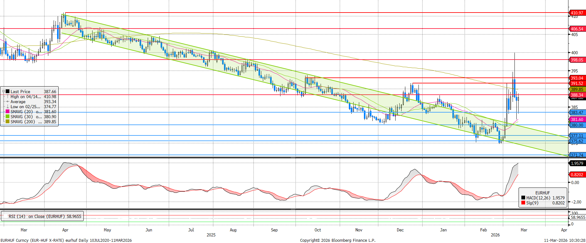 Rendkívül volatilis időszakát éli a forint. Ami meglepőbb lehet, hogy egészen a 400-as lélektani ellenállásáig kellett felszúrnia napon belül az EURHUF árfolyamnak, mire a lefordulás megtörtént. A 200 napos mozgóátlag talán hatásosabb lesz, ahogy csillapodik a globális hangulat, a felpattanások kockázata viszont fennmaradhat a napokban, mivel külső tényezők generálják.