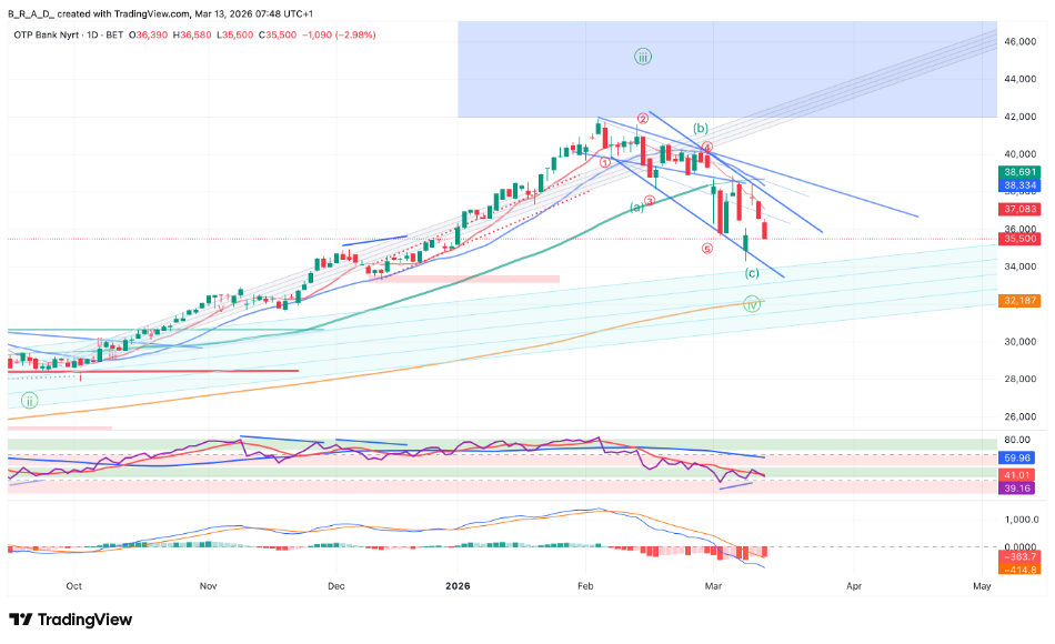 Megjelent a charton egy trendfordulókra jellemző short indikátor-konfiguráció, amelynek az elsődleges célára 36.940, a másodlagos 34.100. A hetes fordulós gyertya kialakulása megfelelő támogatást is adhat a formációnak, ami ekkora mozgásnál elengedhetetlen.