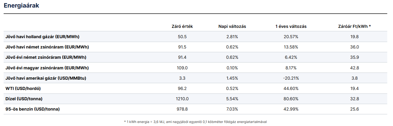 Egyes energiahordozók ára