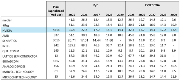 Annak ellenére, hogy az AI-szektor legjelentősebb vállalatáról van szó, az Nvidia értékeltsége meglehetősen visszafogottnak tűnik. A P/E rátája 22,2, ami jóval alacsonyabb a hasonló vállalatok mediánjánál és átlagánál is. A következő években az értékeltségbeli diszkont alacsonyabb lehet, sőt az évtized végéhez közeledve el is tűnhet. Ehhez az kell, hogy az Nvidia nyereségének növekedése jelentősen lelassuljon, míg a többiek gyorsabban növekedjenek. Úgy gondoljuk, hogy ez meglehetősen pesszimista forgatókönyv.