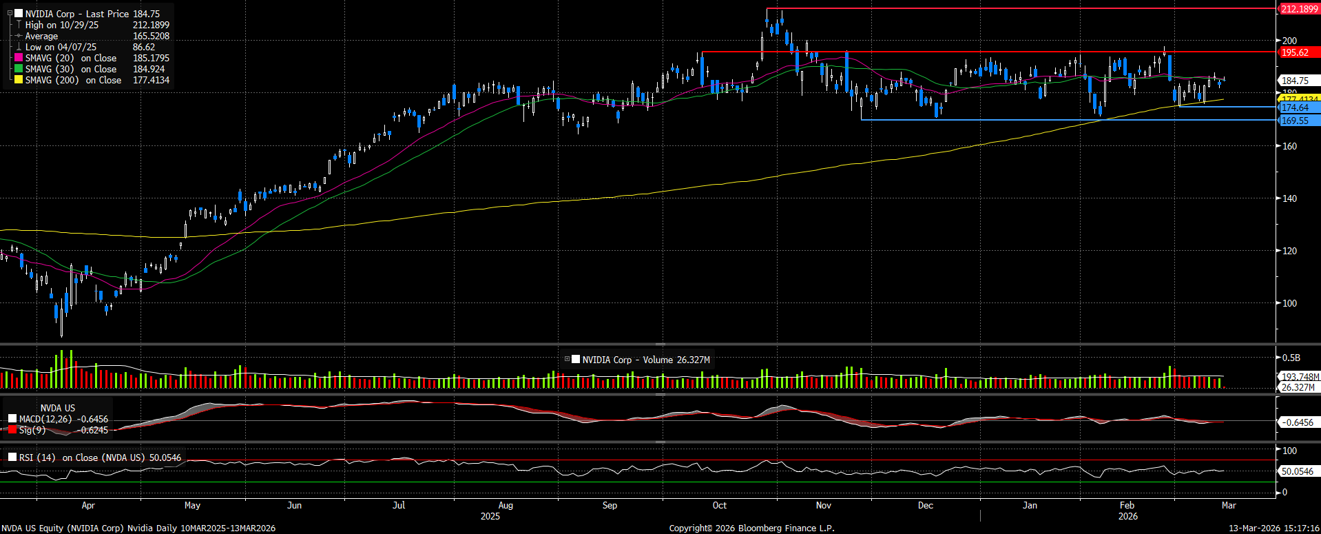 Az Nvidia árfolyama tavaly nyár óta 170 és 200 dollár között oldalazik, nem tudott kialakulni tartós trend. Eközben az eredmények rohamosan javultak, így az értékeltség jóval a megszokott szint alá csökkent. Emiatt indokolt lenne az árfolyam emelkedése, ami hamarosan el is indulhat. Az elmúlt napokban a 200 napos mozgóátlag közelébe került az árfolyam, ahonnan sikerült felpattanni, és most a 20 és a 30 napos mozgóátlaggal küzd. Az MACD indikátor hamarosan vételi jelzést adhat, ami segítené a további emelkedést. A jelenlegi szinten kedvező vételi lehetőséget látunk.