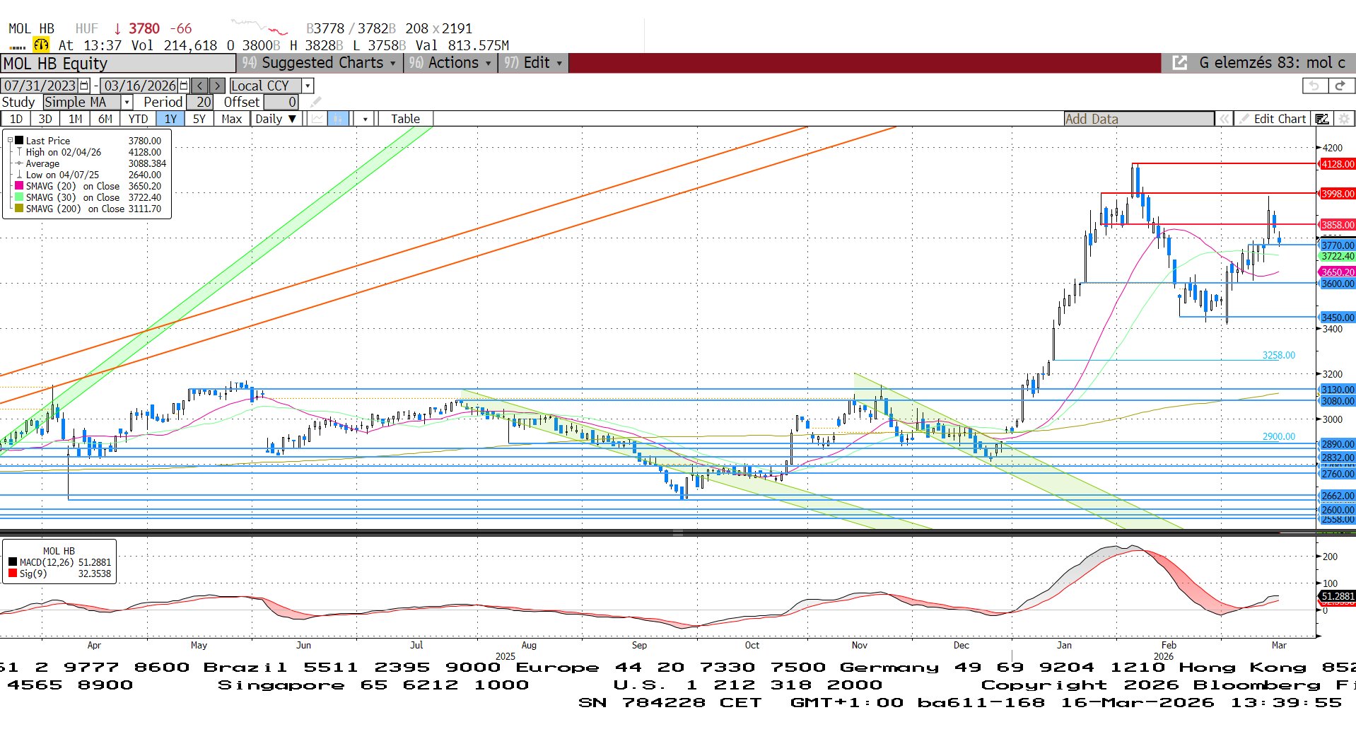 A múlt hét nagy részében folytatta a hónap eleje óta tartó emelkedő trendjét a MOL, és a 4.000 forintos lélektani szint közelébe emelkedett. Itt azonban megtört a lendület, pénteken lefordulás jött. Hétfőn is folytatódik a korrekció, de a 3.770 forintos szint egyelőre jól működik támaszként.