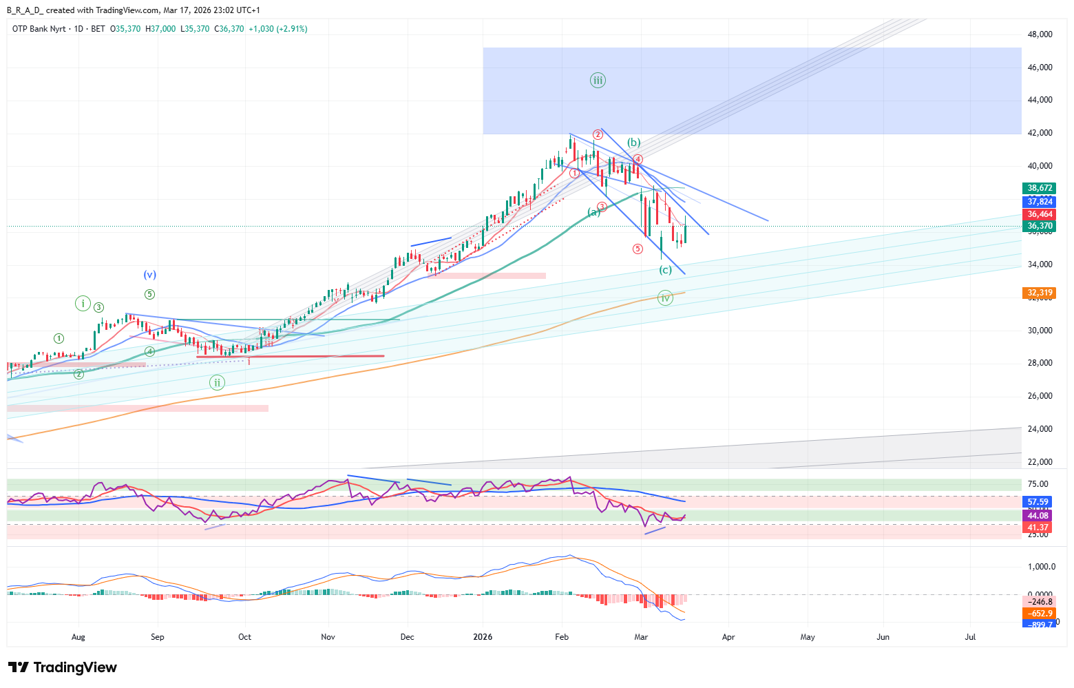 Hetes idősíkon lehetőség van az elmúlt napok mozgása után, hogy kialakuljon egy rejtett bullish divergencia, amely egy erőteljes emelkedés irányába mutatna. Nem alakult ki és nincs meg a megerősítése, de érdemes a hét utolsó napjaiban figyelemmel kísérni, illetve a jövő hét első felében kialakulását követően a megerősítésre fókuszálni. A formáció célára a kékkel jelölt célzóna. Kontextusa a zöld számozással összhangot mutat. A napos idősíkon megjelent fordulós divergencia a hetes idősíkon feltételezhetően megjelenő bullish csúzlival erős párost alkot, ebből a nézőpontból óriási jelentősége is lehet a divergenciának. A 38.800 körüli zóna ellenállás áttörése elengedhetetlen a bullish elképzelések működéséhez.
