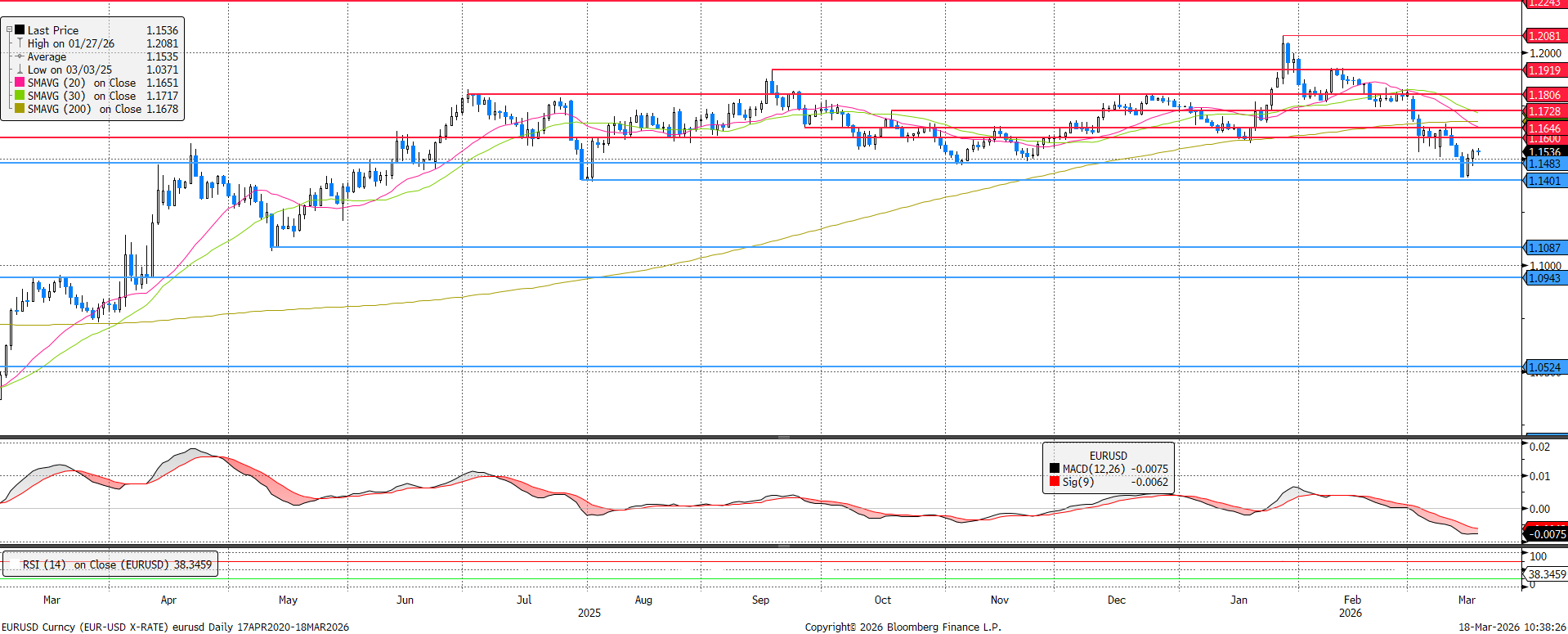 Az 1,160-as szint elesését követően gyors korrekcióba kezdett az EURUSD árfolyama, megközelítve a tavaly júliusi lokális mélypont adta 1,140-es támaszt. Innen végül enyhe felpattanás következett, de az MACD és az RSI alapján ebbe az irányba tarthat az árfolyam.