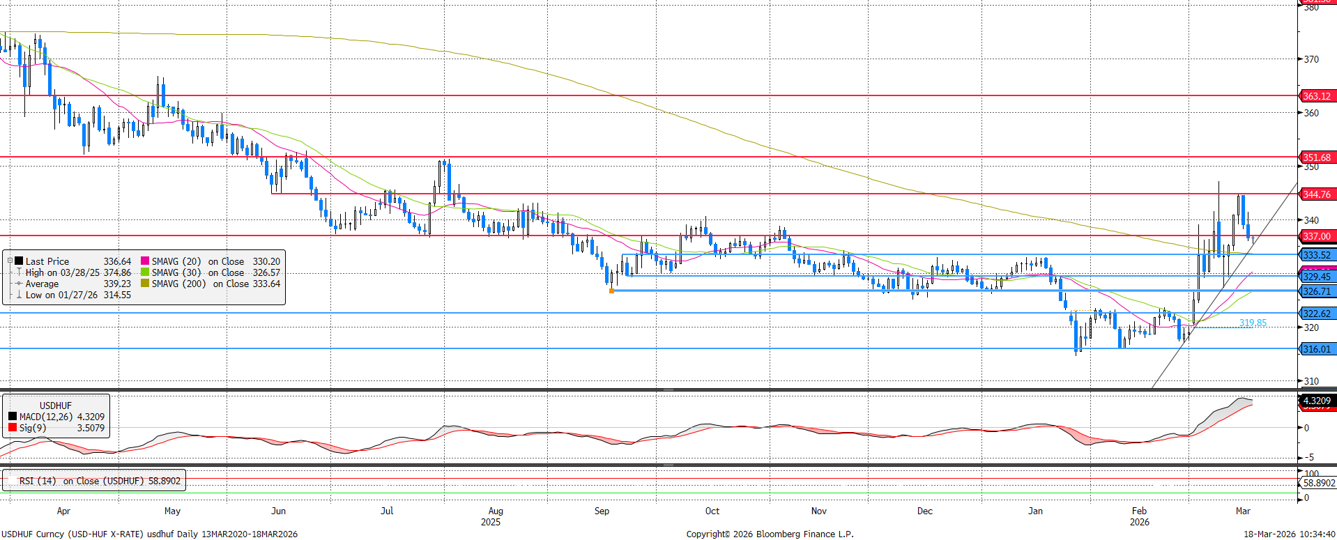 A márciusi árfolyammozgás a leszúrások tekintetében egy egyenesre illeszthetőek. Ha folytatódik ez a fajta trend, az hamarosan tartósíthatja a 340 feletti árfolyamot is. Egyelőre még a 337-es ellenállás és a 200 napos mozgóátlag adta támasz között van a jegyzés, de kifejezetten törékeny az egyensúly.