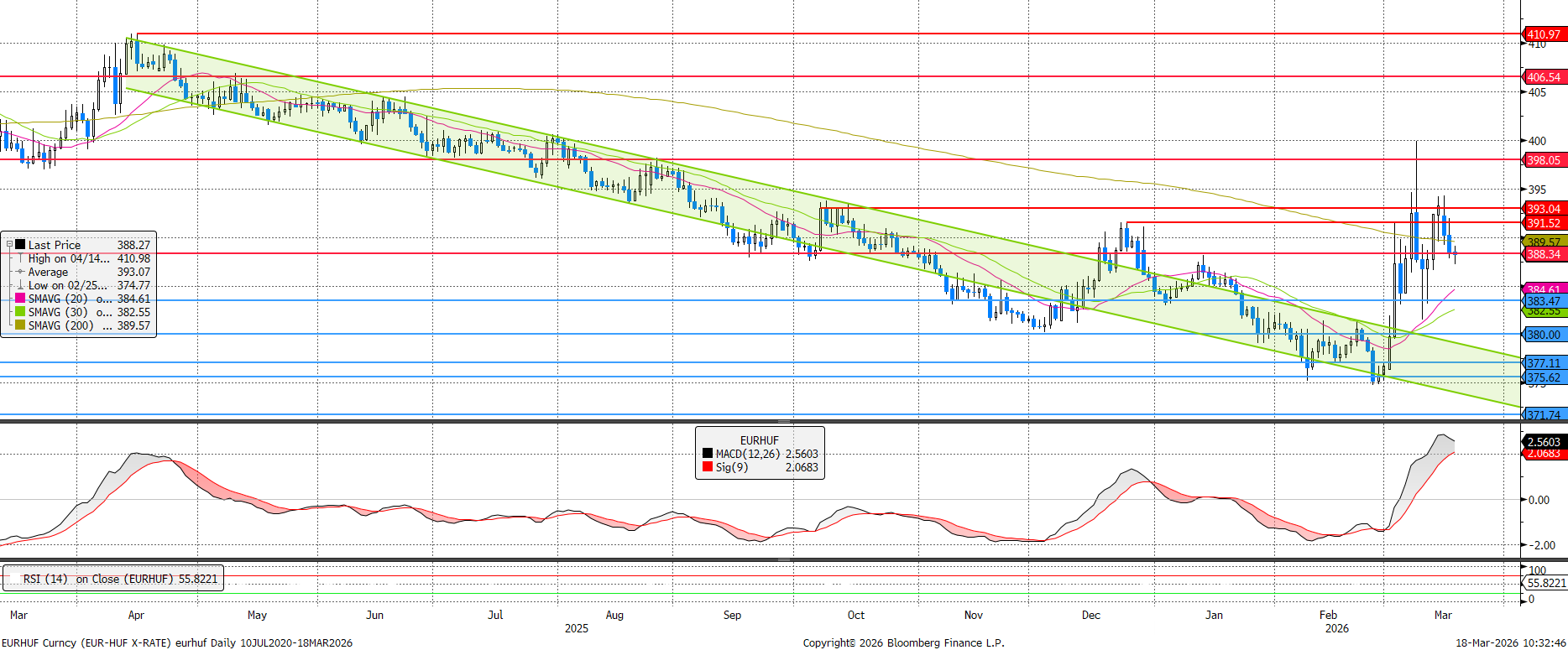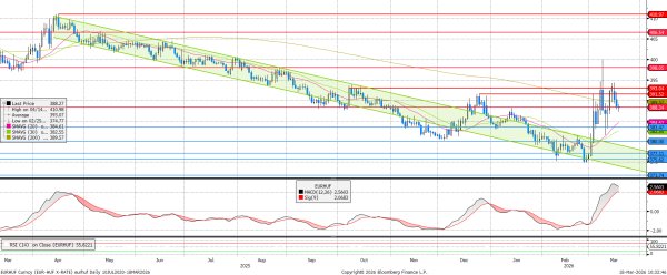 Amint némi stabilizálódás – nem az iráni háború előtti állapot! – látszik a Közel-Keleten, a forint is jobban muzsikál. Az előző hét második felében levő megugrás utáni enyhülés a napokban nagyjából egy héttel ezelőtti szintre hozta az árfolyamot, 390-es EURHUF és a 200 napos mozgóátlag alá. A fordulat közelgő jeleit ezért még mindig érdemes fenntartásokkal kezelni.