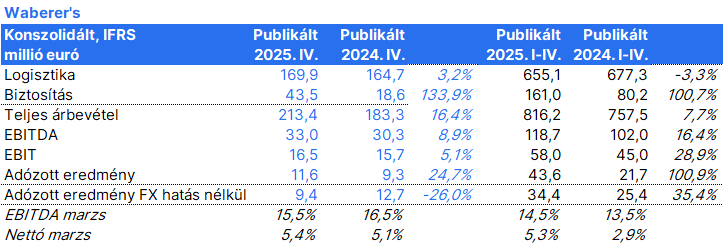 A Waberer’s erős nettó eredményt ért el a negyedik negyedévben (+24%), illetve a teljes évben (+101%), amit az árbevétel növekedése, a javuló árrések és a mérleg további erősödése támogatott. A működési hatékonyság csoportszinten javult, miközben a jövedelmezőség is emelkedett.