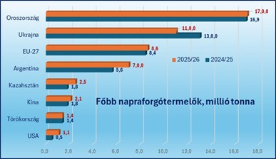 Napraforgó tekintetében a globális növényi olaj termelési térképen igen előkelő helyen szerepelünk. A hazai termelők ráültek a termésre. A kérdés tehát az, hogy a feldolgozók meddig vannak rendben készlettel (a mostani keresleti növekedés arra utal, hogy vásárolniuk kell), illetve, hogyan alakul Argentína termése, exportja. Európán kívül ugyanis ő a legnagyobb piaci szereplő, aki ráadásul elképesztő ütemben növeli napraforgó termelését (is). A 2024/25-ös szezonban 4,7 millió tonna magot termeltek, 2,4 tonnás hektáronkénti hozamok mellett. A következőben a területük további 18 százalékkal nőtt és a hozamok is javulnak, a termés már 7,0 millió tonna! Exportjuk dinamikája igen magas, cél elsősorban India és az EU. Olajuk és féltermékeik komoly piaci potenciállal bírnak.