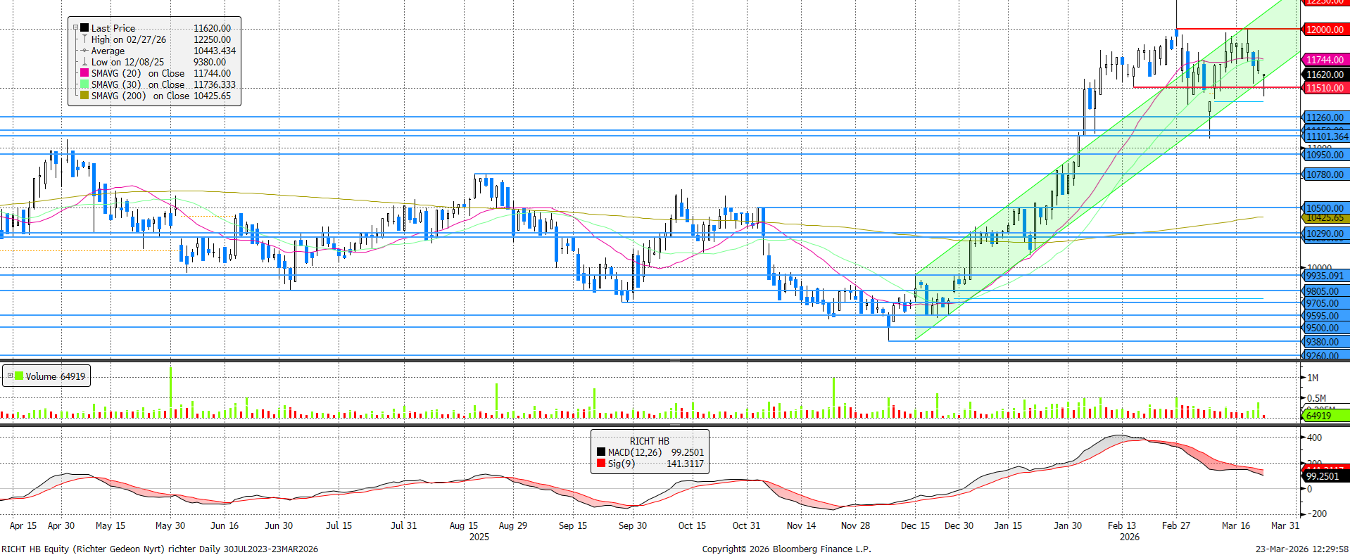 Az elmúlt hetekben 11.510 és 12.000 forint között oldalazott a Richter. Ma ismét a sáv aljára esett az árfolyam, ahonnan emelkedéssel próbálkozhat. Ellenállást a rövidtávú, 20 és a 30 napos mozgóátlag jelent.