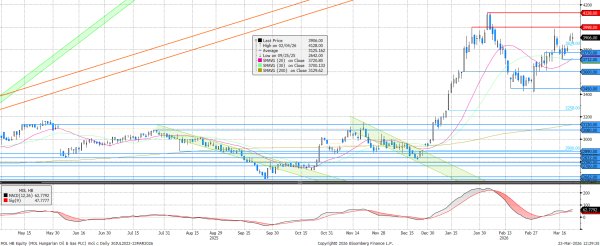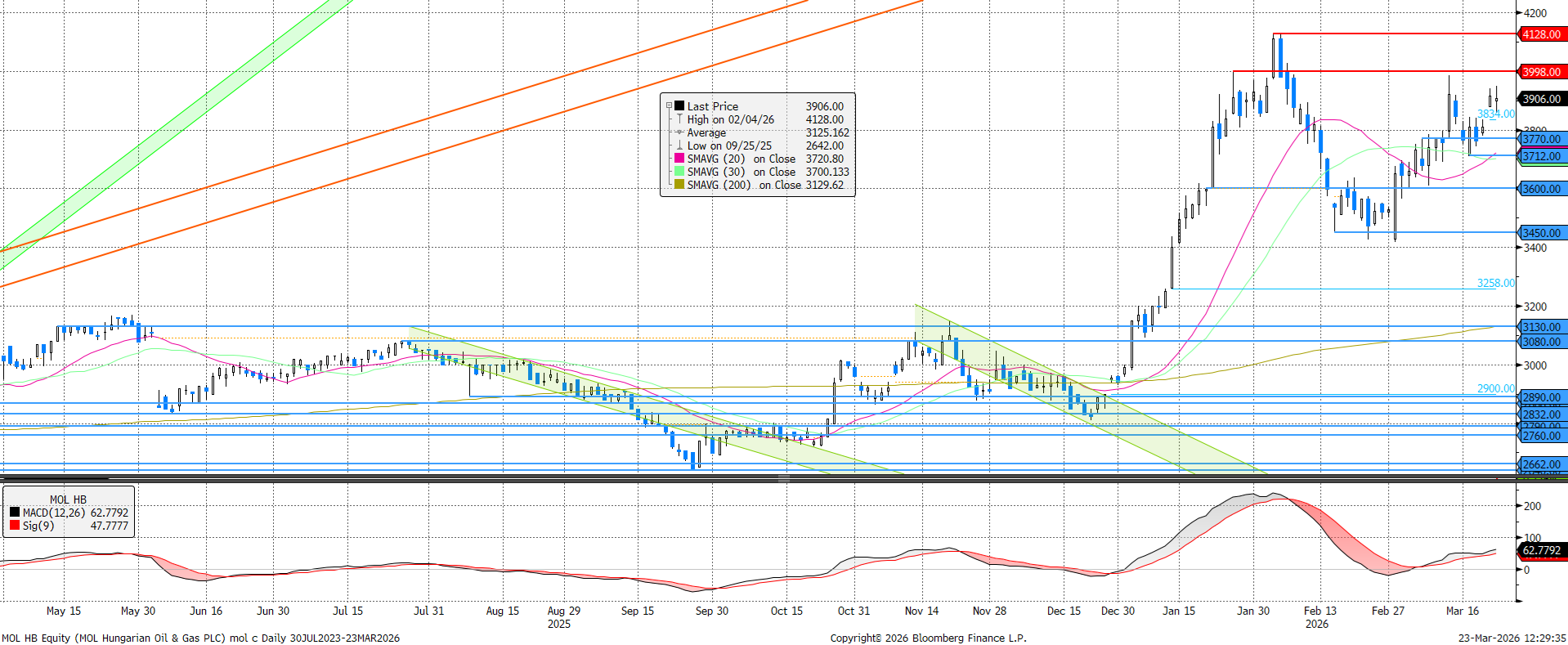 Míg a részvények többsége szenved a magas energiaárak miatt, addig az energiacégek profitálnak a számukra kedvező környezetből. A jelenlegi árfolyam körül sűrűn találhatóak jelentős technikai szintek. Támaszszintet a múlt héten hagyott rés jelent 3.834 forintnál, míg ellenállás 3.998 forintnál található.