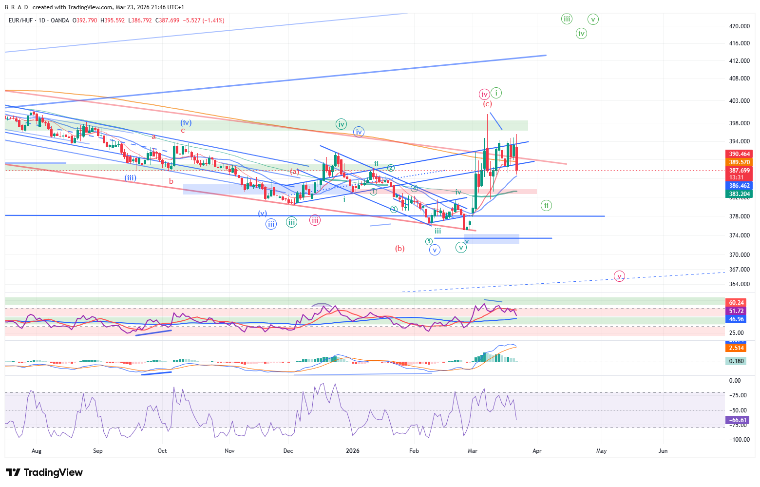 Elliotti megközelítésben vagy egy korrekció C alhulláma halad lefelé (zöld számozás) vagy a pirossal jelölt számozás szerint egy impulzus 5. alhulláma. Ez utóbbi forgatókönyvre egyre kevesebb az esély, amennyiben mégis ezen verzió mentén mozog a piac, a következő hetekben 374 alá bukhat az árfolyam, ennek megerősítéséhez nagyon gyors forinterősödésre lenne szükség a következő időszakban. Amíg nincs a charton kézzel fogható megerősítés a pirossal jelölt verzióra, addig a zölddel jelölt, korrekcióra utaló számozás számít az elsődleges szcenáriónak.