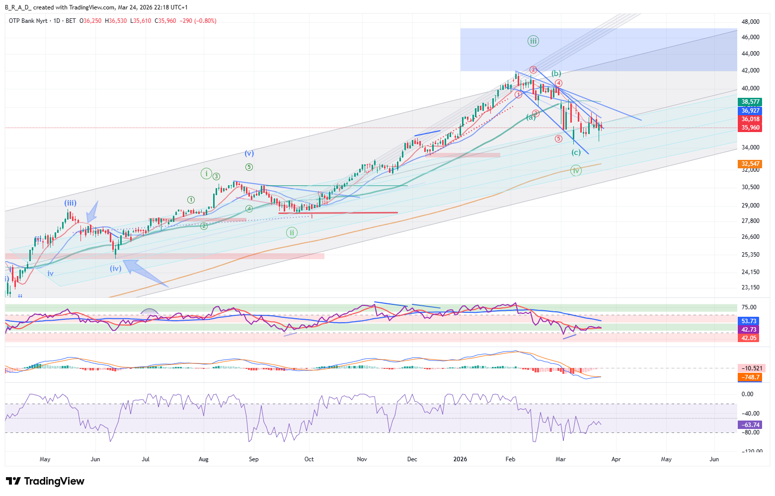 Hetes idősíkon lehetőség van az elmúlt napok mozgása után, hogy kialakuljon egy rejtett bullish divergencia, amely egy erőteljes emelkedés irányába mutatna. Nem alakult ki és nincs meg a megerősítése, de érdemes a hét utolsó napjaiban figyelemmel kísérni, illetve a jövő hét első felében kialakulását követően a megerősítésre fókuszálni. A formáció célára a kékkel jelölt célzóna. Kontextusa a zöld számozással összhangot mutat. A napos idősíkon megjelent fordulós divergencia a hetes idősíkon feltételezhetően megjelenő bullish csúzlival erős párost alkot, ebből a nézőpontból óriási jelentősége is lehet a divergenciának. A 38.800 körüli zóna ellenállás áttörése elengedhetetlen a bullish elképzelések működéséhez.