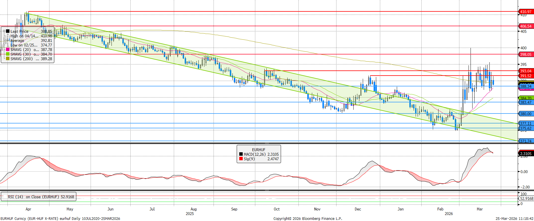 Az EURHUF mozgása továbbra is hosszú, elnyújtott gyertyákkal tűzdelt, napon belül pedig jellemzően még magasabb értékekre szökik fel az árfolyam. Amilyen hosszadalmas volt a forintnak erősödnie, annyira gyorsan fáradt el a nemzetközi devizákkal szemben. Bár épp a 200 napos mozgóátlag alatt van a jegyzés, ez nem jelentett sokat az utóbbi időben. Az MACD eladási jelzése viszont rövidtávon segíthet fogást találni az eurón. Valójában viszont az iráni eseményektől függ a tényleges irány.