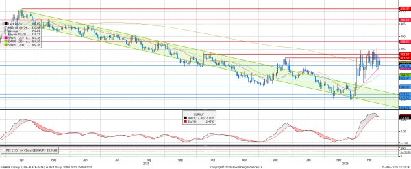 Az EURHUF mozgása továbbra is hosszú, elnyújtott gyertyákkal tűzdelt, napon belül pedig jellemzően még magasabb értékekre...