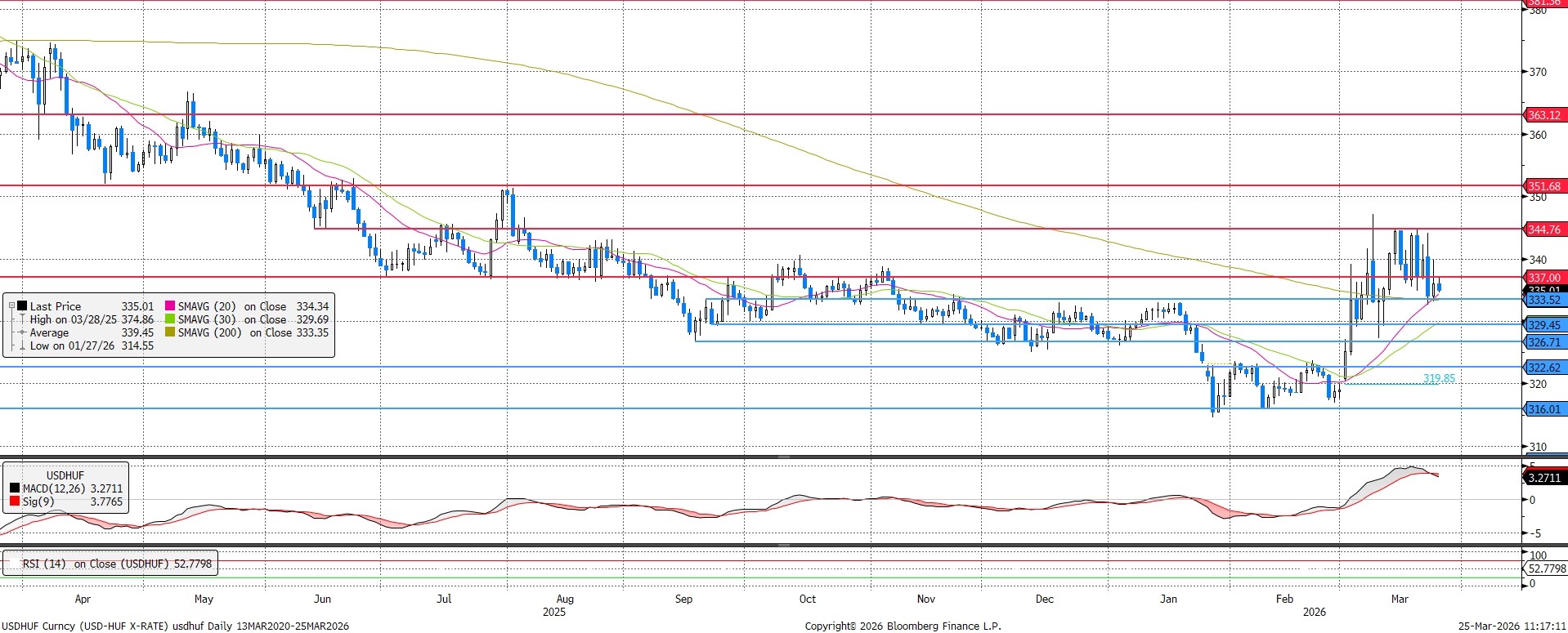 Miután lefordult a 344,8-as sizintről az USDHUF árfolyama, szerdán már a 337-es szint alá erősödött a forint. Támaszként a 333,5-ös szint és az ezzel majdnem azonos szinten levő 200 napos mozgóátlag szolgál, de a 20 napos is jelen van 334 fölött kicsivel. Az MACD eladási jelzése a forint oldaláról kedvező, de igazi enyhülést a geopolitikai kockázatok csökkenése hozna elsősorban.