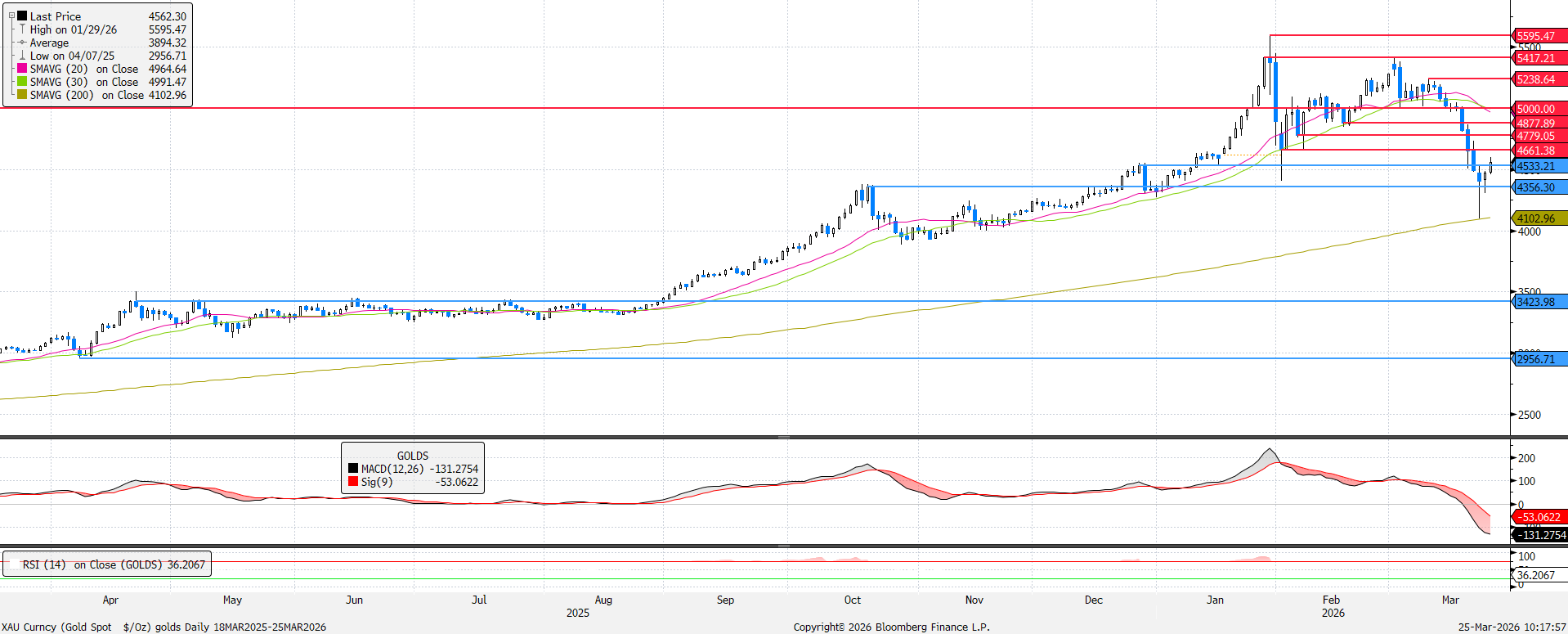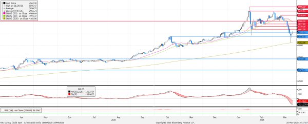 Gyakorlatilag gond nélkül olvadt le kevesebb, mint egy hét leforgása alatt közel 20% az arany árfolyamból hétfőig. A mélyrepülést a 4.103 dollár körüli 200 napos tudta megtörni végül. Innen felpattant, a 4.533 dolláros támaszszint fölé került, ami 2025-ig mindenkori csúcs volt. A technikai kép alapján folytatódhat az erősödés, viszont a Fed kamatcsökkentési várakozásainak kiárazódása és az emelés lehetőségének megjelenése miatt lehet, hogy csak átmeneti emelkedésről van szó.