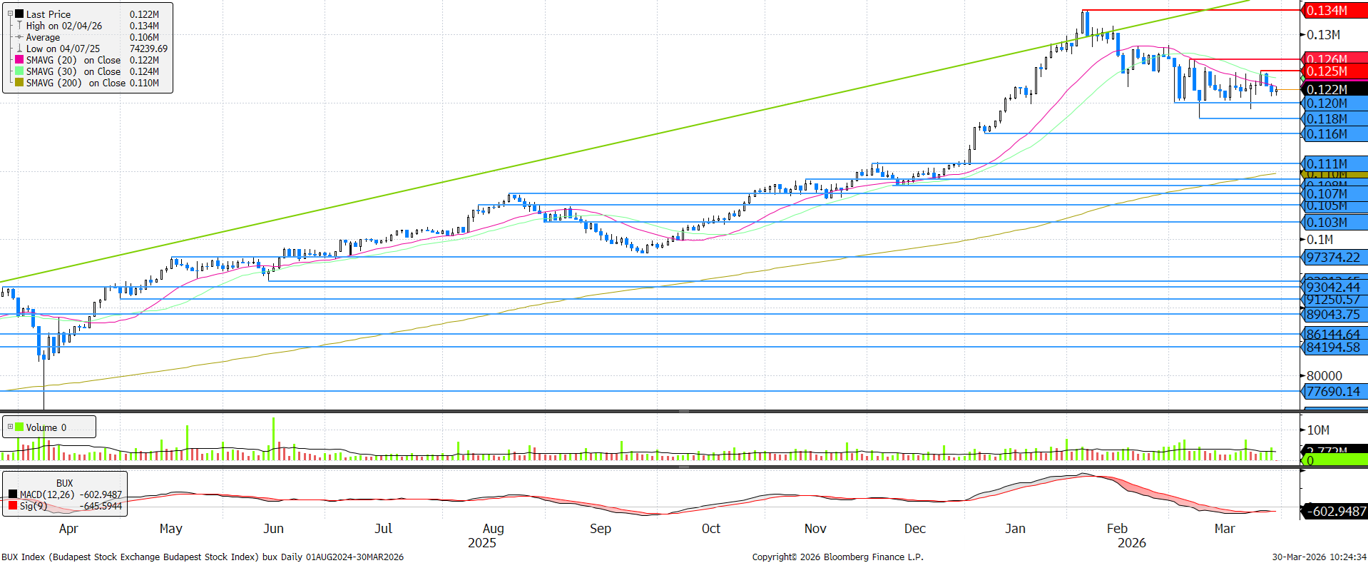Az indexet alkotó blue-chip komponensek egy része emelkedéssel próbálkozna, míg másik részüktől csak oldalazásra futja, így a BUX-tól sem várható erőteljes teljesítmény, hiába adott múlt héten vételi jelzést az MACD indikátor. A következő napokban így várhatóan csak oldalazni fog az index.