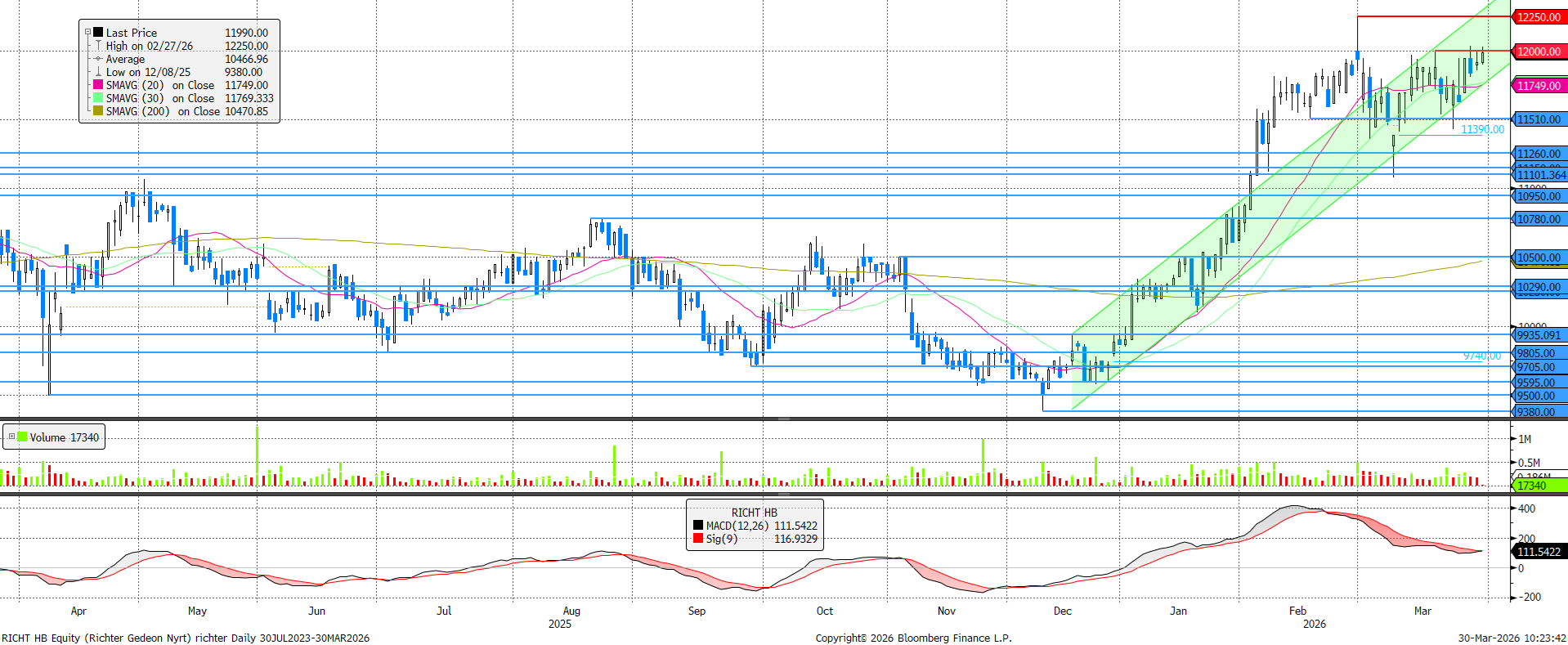 Hetek óta a 11.500 és 12.000 forint közötti tartományban mozgott a Richter árfolyama. Pénteken pozitív hírt kapott a Richter az egyik nagy reményű, innovatív nőgyógyászati készítményével kapcsolatban, ami újabb lendületet adhat az árfolyamnak, így akár a 12.250 forintos történelmi csúcsot is megcélozhatja.