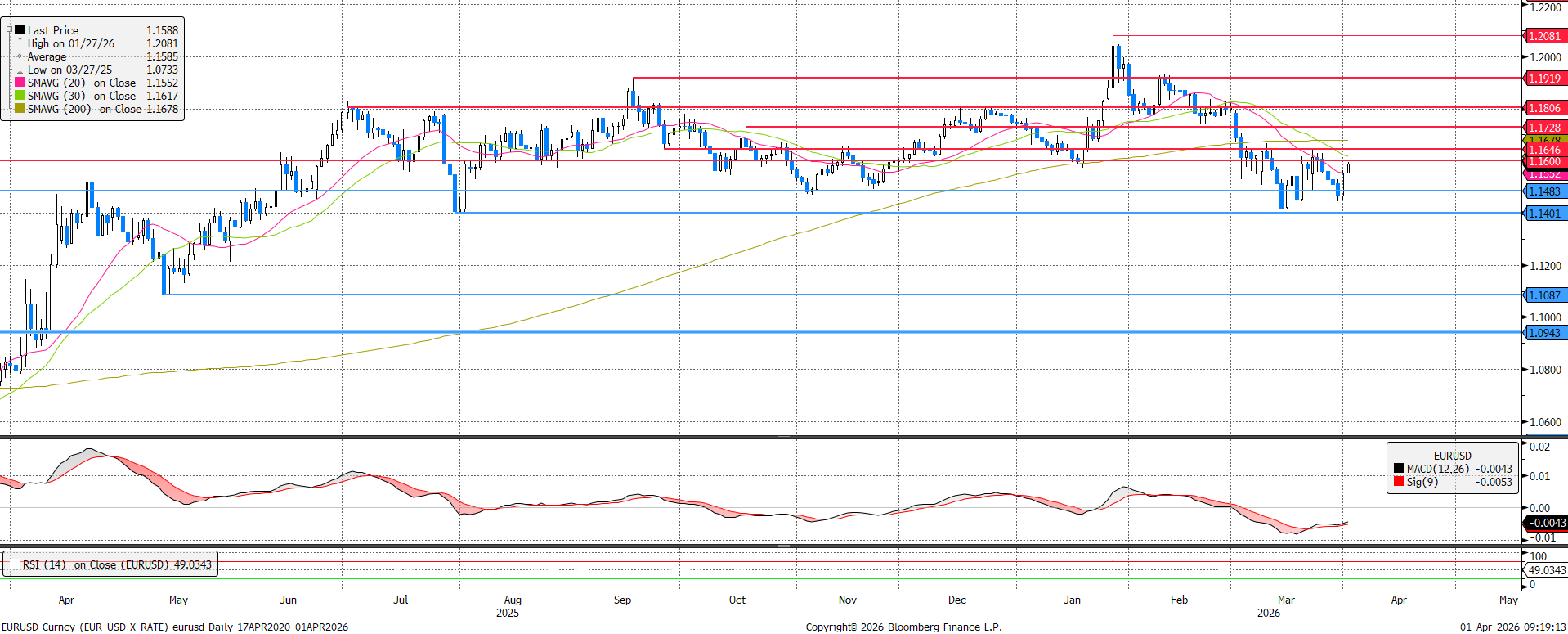 A márciusi 1,140 körüli mélyponthoz képest felpattanásban van az EURUSD, közeledik az 1,160-os ellenálláshoz. Támaszt a...