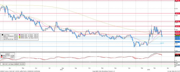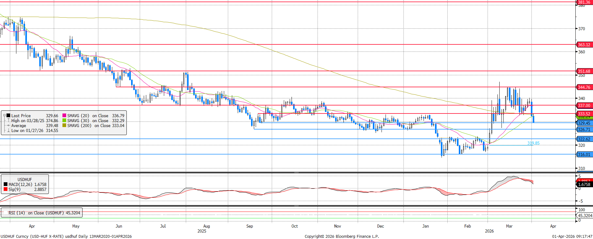 Egészen keddig kellett várni, hogy az MACD eladási jelzésével megegyező irányba mozogjon az USDHUF árfolyama. Ez inkább az iráni-amerikai megállapodás esélyének növekedésről, ezen keresztül a dollár gyengüléséről szól, mintsem a forint megtáltosodásáról. Így vagy úgy, de a 20-30, illetve a 200 napos mozgóátlagot is átszelte, a 329,5-ös támaszon találva magát.