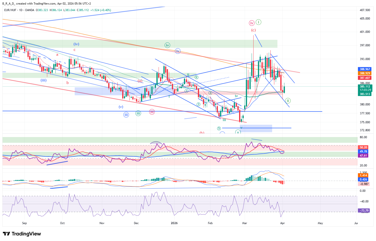A következő időszakban alacsony megbízhatóság mellett emelkedésre számítunk, melynek az elsődleges célára 387,50, erőteljes mozgás megindulásának esetére a másodlagos célár 396, a harmadlagos 397.