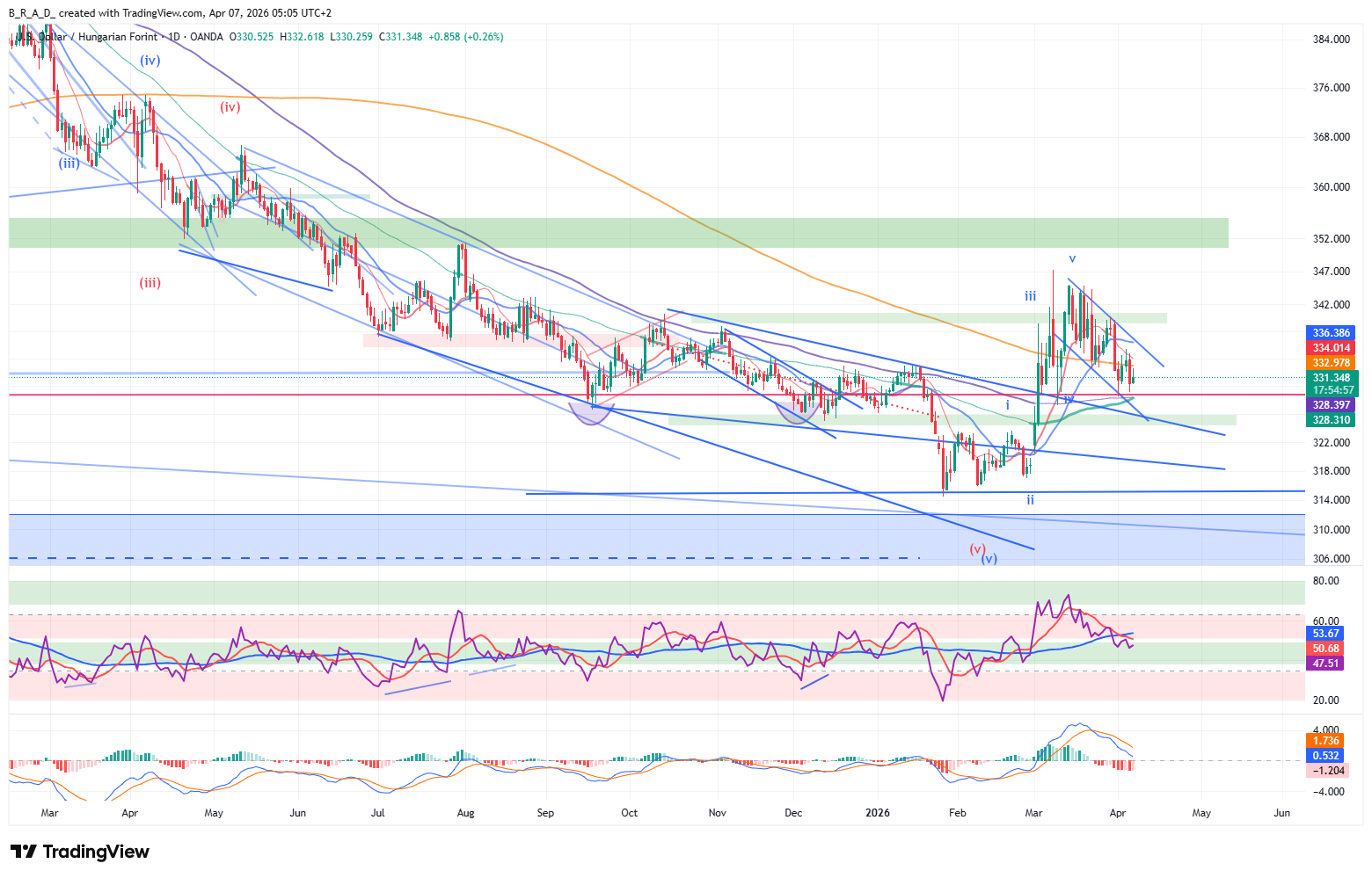 A következő időszakban az 50 napos mozgóátlagig való leszúrás lehetősége mellett, emelkedésre számítunk az elsődleges célár 334,90, a másodlagos 339,80.
