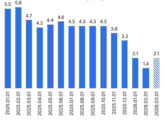 A harmadik havi adatok jelzik az első kihatásait a közel-keleti konfliktusnak. Első körben főként az üzemanyagárakon, valamint az importált élelmiszereken és a volatilis repülőjegy árakon keresztül válik láthatóvá. Ezek eredményeként a februári 1,4-ről 2,1 százalékra emelkedhet az éves index márciusban.