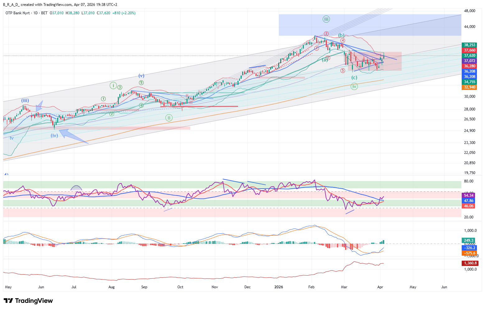 Az RSI indikátoron kialakulóban van egy olyan indikátorkép, amely erőteljes emelkedést vetít előre, amennyiben az árfolyam a következő két napban sikeresen átlépi a keddi kereskedésben látott napi tetőt. Ebben az esetben gyorsan 40.000 fölé érkezhet meg az árfolyam, de több napos időtávon a nagyobb idősík célzónájához (kék téglalap) történő visszatérés is reális lehetőség. A formáció elsődleges célára 39.470-re, a másodlagos 41.520-ra, míg a harmadlagos 45.150-re mutat, mely a magasabb idősík korábban felrajzolt célzónájának a közepe. Ilyen mozgások, aktuális pozícióban általában jelentős fundamentális megerősítéssel szoktak megérkezni,érdemes ezekre a hírekre fókuszálni a következő időszakban. Az indikátorkép a csúzli létrejöttére utal.