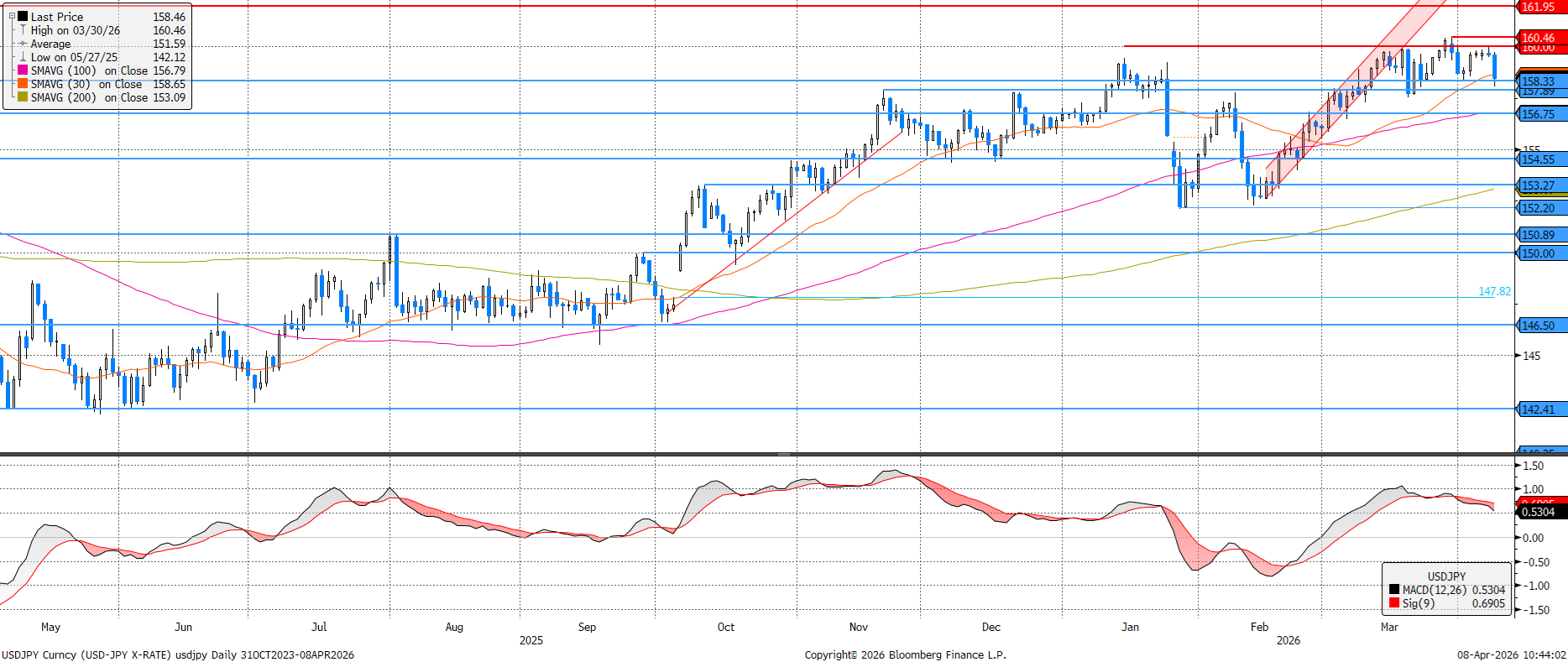 Rendkívül magas szinten, 158-160 között oldalazott az elmúlt hetekben az USDJPY. Ma a sáv aljára esett az árfolyam, de a folytatásban akár a támasz törésére is sor kerülhet, ezzel a jelenlegi gyenge szintről erősödhet a japán jen.