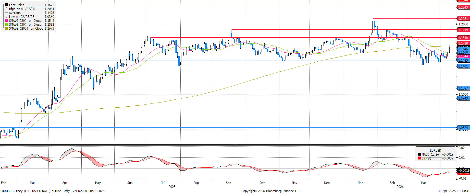 A tűzszüneti hírekre az eddigi pánik üzemmódból a piacok elkezdtek visszatérni a rendes kerékvágásba. Ezzel együtt a dollár is elkezdett háttérbe kerülni, ami az euró erősödését eredményezte. Az árfolyam jelenleg a 200 napos mozgóátlag környékén billeg. A hosszútávú mozgóátlag áttörését követően tovább folytatódhat majd az EURUSD emelkedése.